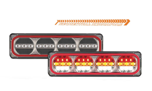 LIGHT COMMERCIAL COMBO TAIL LAMP. TWIN PACK. 12/24V.WITH SEQUENTIAL INDICATOR. 387MM X 105MM X 30MM HIGH. PAIR. Part number: 385ARWM-2