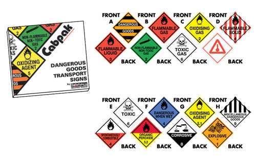 SKU: CIXCABKITPLASTIC POUCH CONTAINING 2 EACH OF THE COMMON DANGEROUS GOODS SIGNS. PLASTIC BACKING 250MM X 250MM. Part number: CABKIT