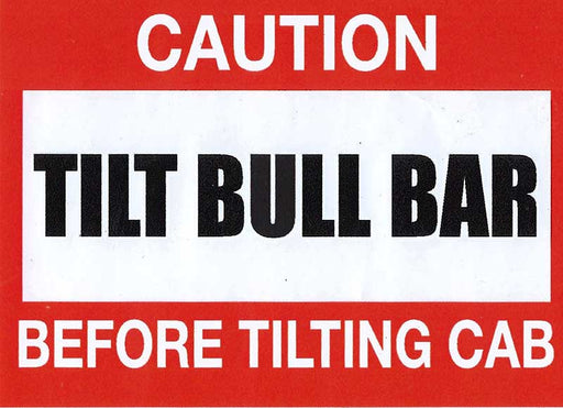SKU: SAFSTBBCAUTION TILT BULL BAR BEFORE TILTING CAB 125MM X 90MM. RED/WHITE/BLACK DECAL. Part number: STBB
