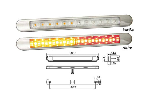 SKU: LED285CAW12LED INDICATOR AND PARKER. 12V ONLY. CLEAR WHEN INACTIVE. AMBER/WHITE ACTIVE. 285MM X 25MM X 10MM DEEP. SURFACE MOUNT. Part number: 285CAW12