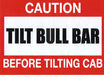 CAUTION TILT BULL BAR BEFORE TILTING CAB 125MM X 90MM. RED/WHITE/BLACK DECAL. Part number: STBB